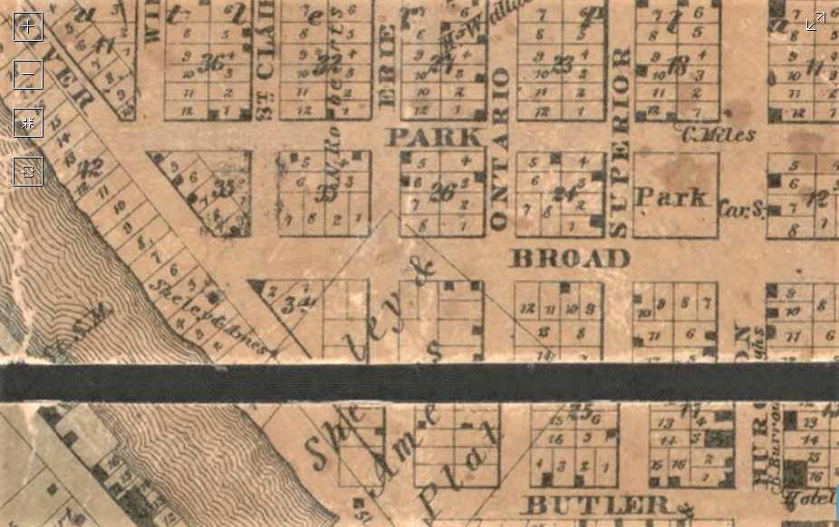 Early map of Port Huron showing the park west of which was built the first school. This early era area of Port Huron is now taken up by McMorran plaza and the community college.